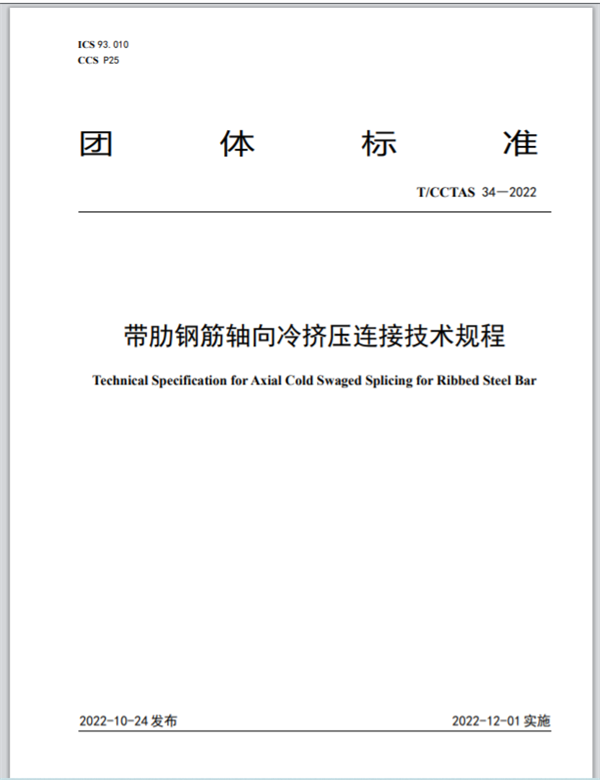 《带肋钢筋轴向冷挤压连接技术规程》由中国交通运输协会新技术促进分会提出,由中铁工程设计咨询集团有限公司牵头,联合杭州安克徕斯新材料科技有限公司、中国铁道科学研究院集团有限公司、中国铁路经济规划研究院有限公司、青岛铭功建筑工程科技有限公司等32家单位共同起草,于2022年10月24日发布,12月1日起实施。该标准规定了带肋钢筋轴向冷挤压连接的基本规定、接头应用、型式检验、现场安装、检验与验收等,有利于提高钢筋混凝土结构施工的钢筋连接技术水平,规范轴向冷挤压钢筋连接技术的设计、施工及验收。