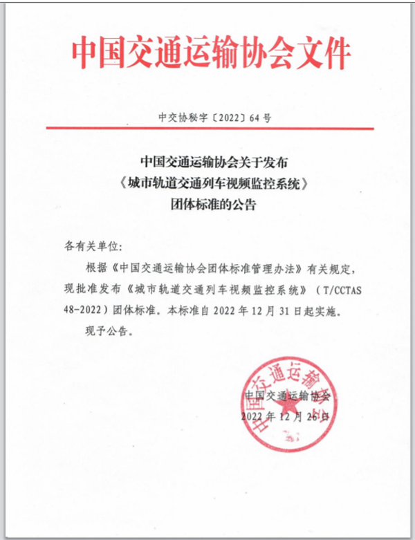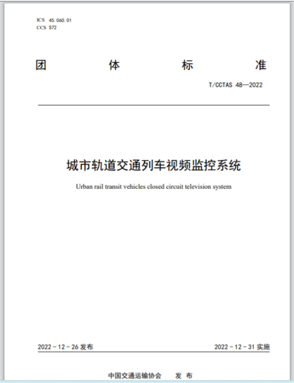 《城市轨道交通列车视频监控系统》由中国交通运输协会新技术促进分会提出,由中车青岛四方机车车辆股份有限公司牵头,联合中车南京浦镇车辆有限公司、郑州地铁集团有限公司运营分公司、济南轨道交通集团有限公司建设投资公司、苏州华启智能科技有限公司、天津市北海通信技术有限公司、中车成都机车车辆有限公司、北京贝能达信息技术股份有限公司、北京航空航天大学、中交协联交通科学研究院(北京)有限公司等十家单位共同起草,于2022年12月26日发布、12月31日起实施。该标准规定了城市轨道交通列车视频监控系统的使用条件、技术要求、检验方法、检验规则及标志、包装、运输和储存等,为城市轨道交通车辆列车视频监控系统的开发和应用提供了技术支撑。