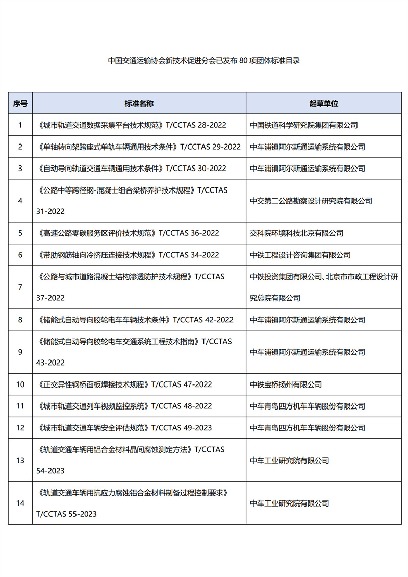 中国交通运输协会新技术促进分会牵头编制发布的团体标准突破80项是分会标准化工作的重要里程碑,标志着分会标准化建设进入新阶段。未来,分会将在中国交通运输协会的指导下,继续深入贯彻落实国家标准化发展战略,紧密围绕行业发展需求,以创新驱动为引领,以质量提升为核心,持续完善标准体系,强化标准实施应用,为推动交通运输行业创新发展作出新的更大贡献。